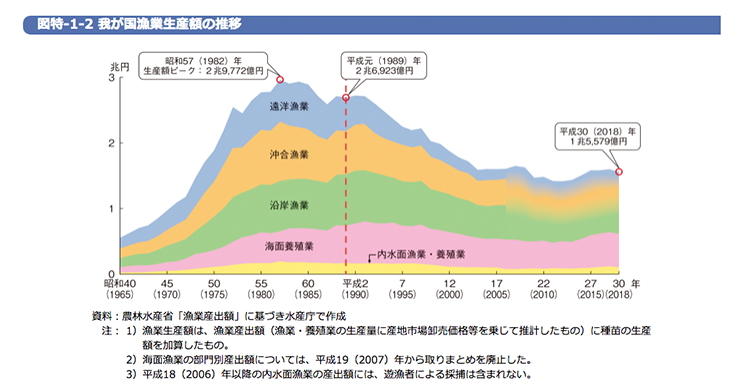 世界の漁業が成長を続けているのに比し、日本の漁業は逆に縮小しているとよく言われます。しかし、実態はどうでしょうか?以下の2つの図をご覧いただくと少し「誤解」があるように感じます。