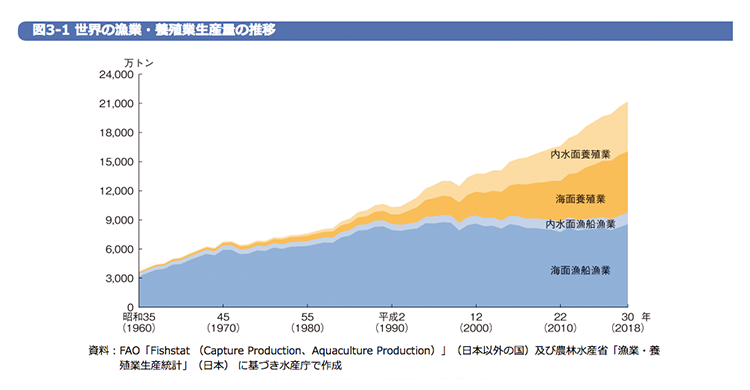 世界の漁業が成長している内訳は「養殖」であって、「天然魚」に関しては日本同様に横這いである、という実態を見て取ることができます。つまり、日本の漁業は「天然魚」を見れば世界とそれほど差があるというわけではない、比較的うまくいっている、ということも言えるのです。