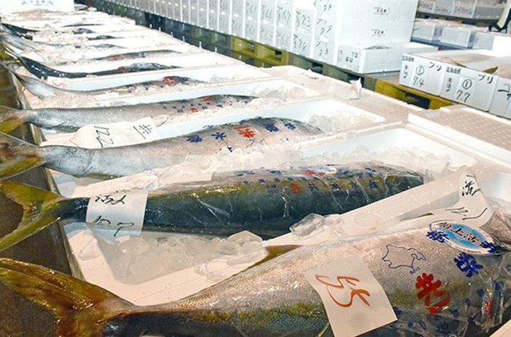 9月6日、札幌市中央卸売市場の魚介の売り場では、発泡スチロールの中で、氷漬けになった大ぶりなブリが大量に置かれていました。...